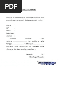 Surat keterangan sakit hanya dapat dibuat oleh mereka yang memiliki keahlian dibidang kesehatan dan tidak berisikan keterangan, menandakan yang bersangkutan sedang sakit dari dokter terkait. Surat izin sakit adalah surat yang menerangkan seseorang dalam keadaan sakit sehingga tidak surat ini umumnya dikeluarkan oleh pihak yang berwenang dalam hal kesehatan, yaitu dokter. Seperti yang kita ketahui, dalam beberapa keperluan, surat keterangan sehat dan sakit sangat dibutuhkan. Lingkar utara jambi 55584 telp. Surat sakit, yang terkadang disebut sebagai surat dokter, surat izin dokter, atau surat keterangan sakit, adalah surat keterangan dari dokter mengenai kondisi kesehatan anda dan pengaruhnya.